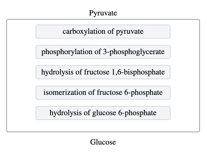 In de glycolyse is de vorming van pyruvaat en ATP door pyruvaatkinase onomkeerbaar. Deze stap wordt omzeild door twee reacties in de gluconeogenese: