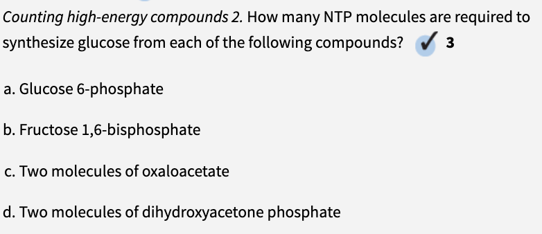 Hoeveel NTP moleculen zijn nodig voor de synthese van één molecuul glucose uit twee moleculen pyruvaat? Hoeveel NADH moleculen?