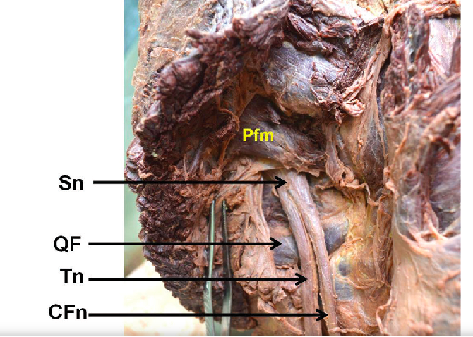 CFn — common fibular nerve; Tn — tibial nerve; Pfm — piriformis muscle; QF — quadratus femoris muscle; Sn — sciatic nerve.