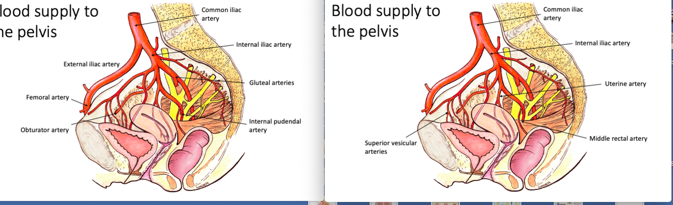Which arteries split from the common iliac arteries and stay in the pelvis? [3]