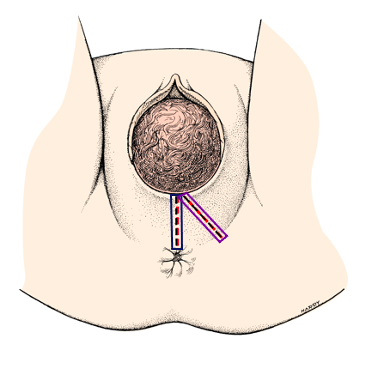 Midline episiotomy: Posterior aspect of labia minora (fourchette) along midline