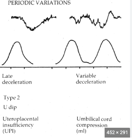 Explain the significance and causes of variable decelerations and late deceleration in Cardiotocography [2]
