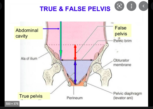 True pelvis = contains all the pelvic organs (vagina, uterus, rectum, bladder, etc)