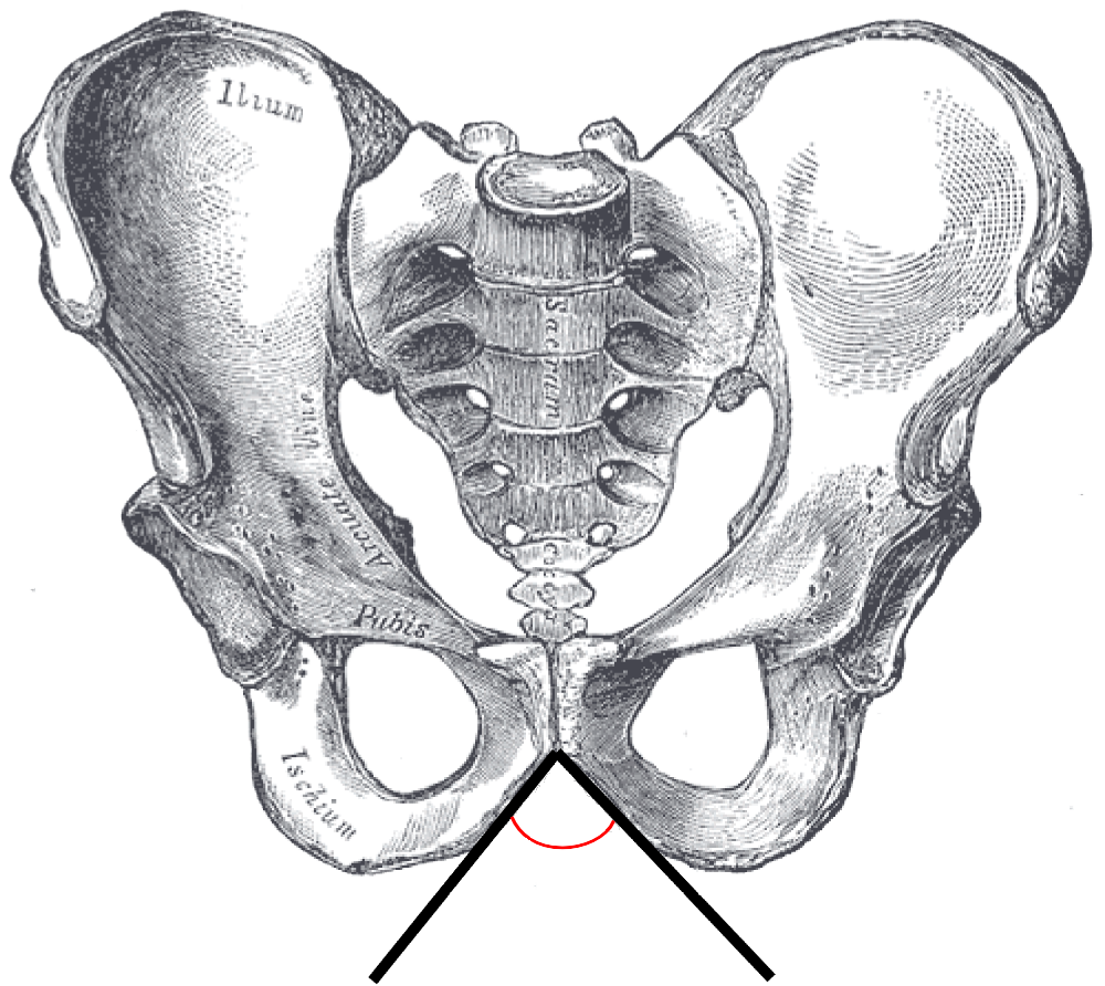 Male = Smaller sub-pubic angle, heart shaped pelvic inlet