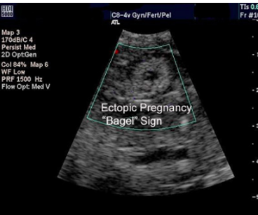 State the 4 things you do to diagnose an ectopic pregnancy? [4]