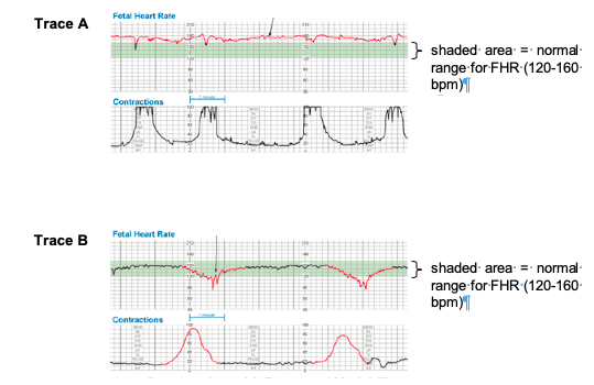 Trace B – Late decelerations or Type II dips (1 mark). FHR returns to baseline after the contraction has ended (1 mark).