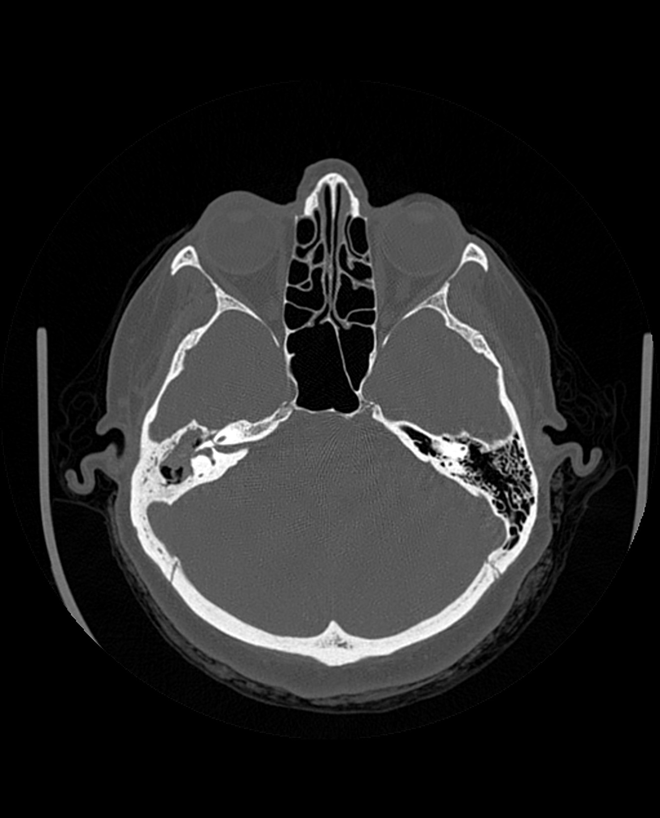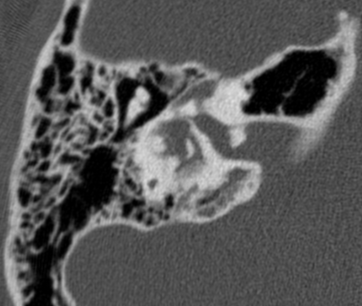 The labyrinth is abnormal with the cochlear absent (cochlear aplasia). The vestibule, semicircular canals and ossicles are present.