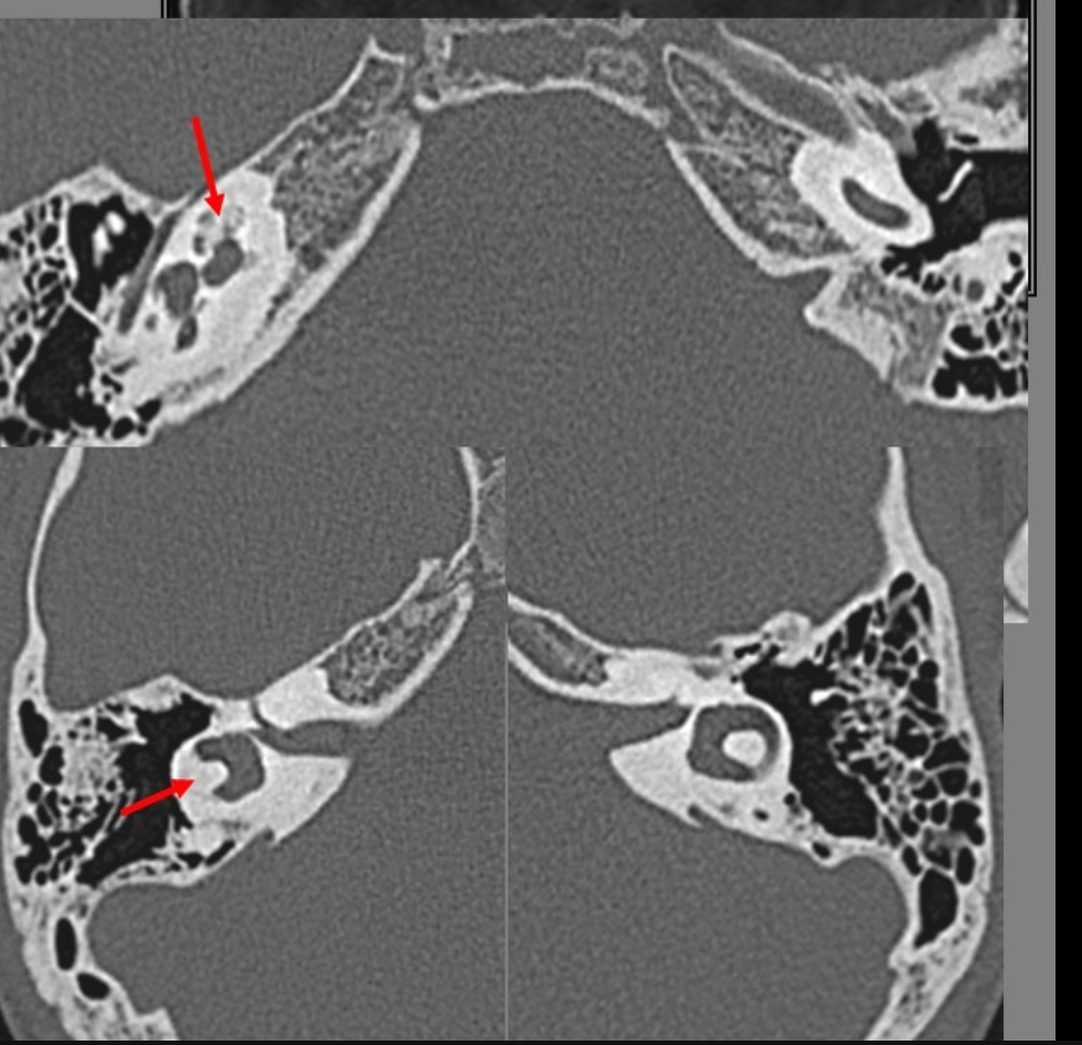 severe disease: membranous labyrinth completely obliterated by bone replacing fluid spaces