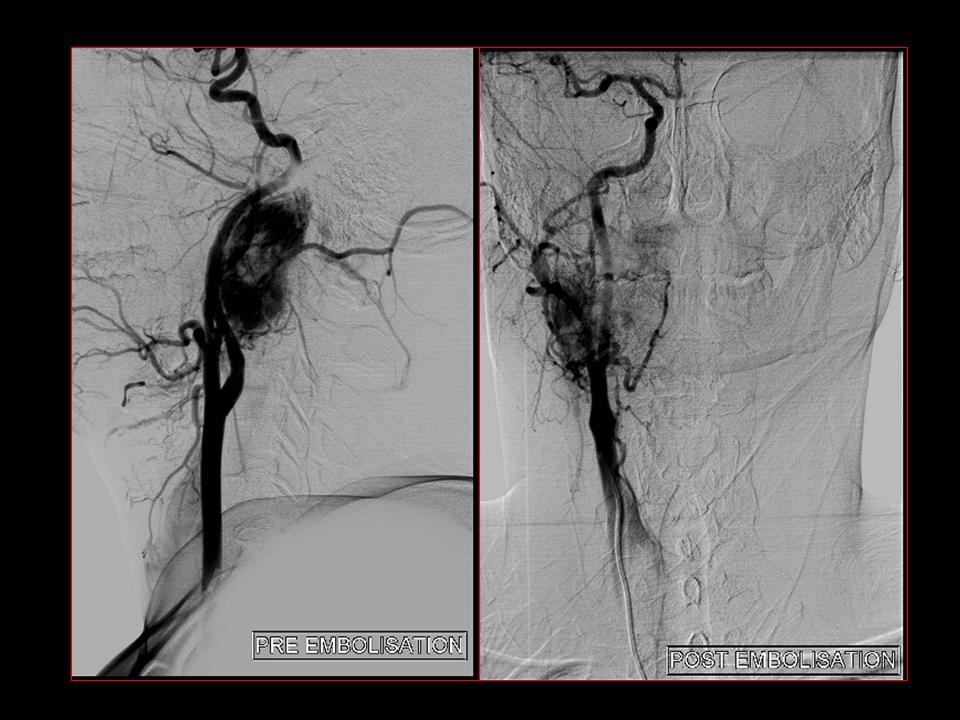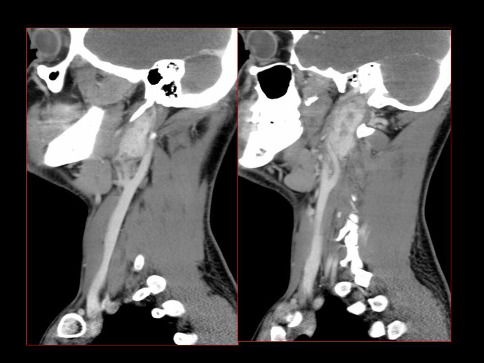 Although they could occur at a similar position to carotid body tumours they tend to be more rostral in location and do not widen the carotid bifurcation. They displace the internal and external carotid arteries anteriorly, and the internal jugular vein posteriorly 1.
