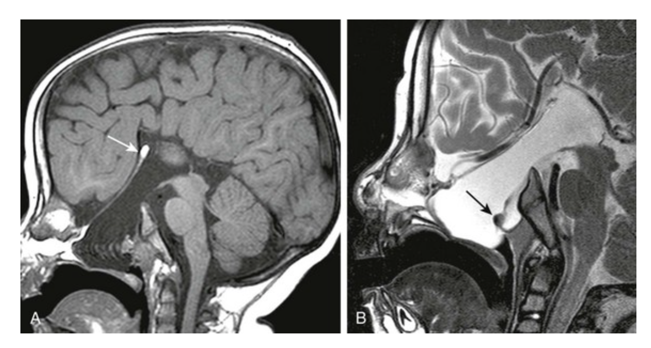 FIGURE 31-5 Basal encephalocele.A, A sagittal T1-weighted image shows callosal agenesis with a tiny lipoma (arrow). A large defect in the basisphenoid is seen. Note the apparent absence of the pituitary, floor of the third ventricle, and optic pathways. B, A high-resolution sagittal T2-weighted image shows the pituitary-hypothalamic structures (arrow) and optic pathways are contained within the encephalocele.
