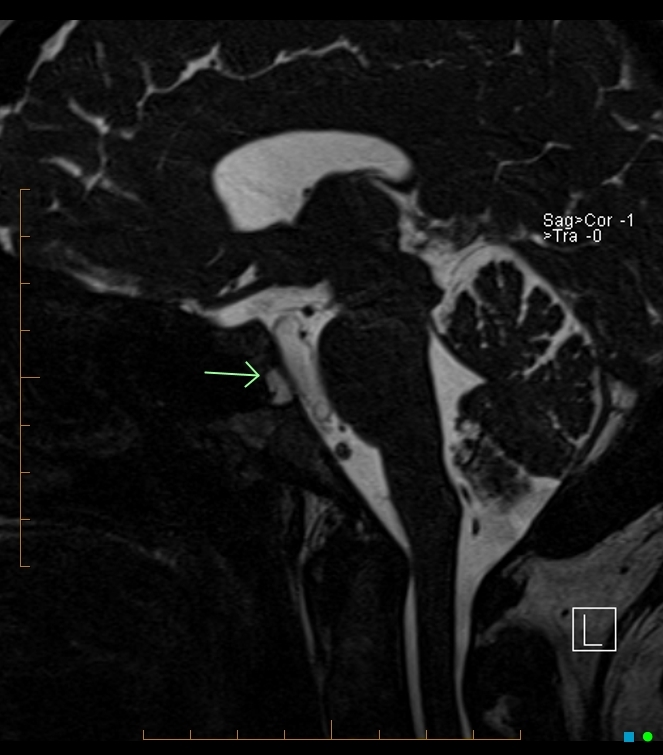 There has been some controversy as to whether intradural chordoma and large ecchordosis physaliphora are different entities. Some authors (such as Wolfe et al.) proposed the name ‘intradural chordoma’ for all intradural notochordal remnant lesions 8. Others (such as Rodriguez et al.) proposed that all intradural notochordal remnant lesions should be called ecchordosis physaliphora, until chordoma are pathologically proven to arise from the intradural compartment 9. However, they are currently considered distinct pathologies with a common origin.