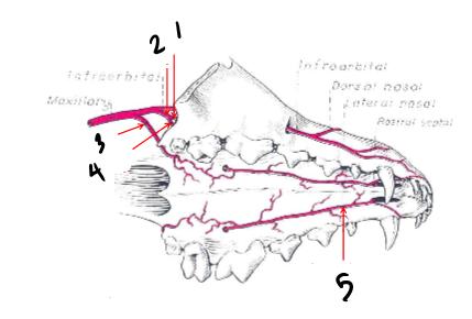 Passes caudal to the hard palate and is distributed to the soft and hard palates