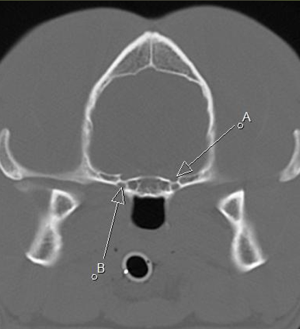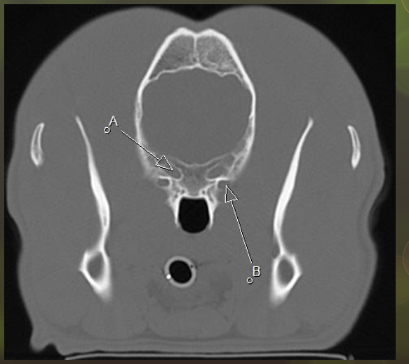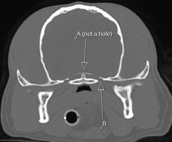 B rostral alar foramen leading to alar canal, round foramen inside the skull