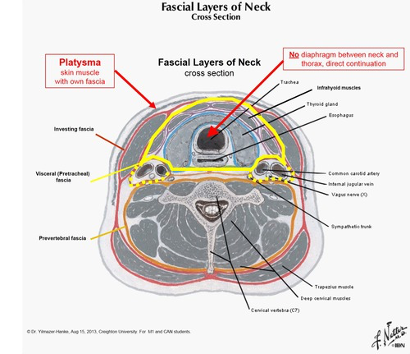 Pre-Tracheal Fascia - Encloses thyroid gland, trachea, oesophagus and fuses laterally with carotid sheath.