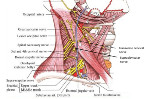 - N: Brachial Plexus (at base), Cutaneous branches of Cervical Plexus (3rd and 4th cervical nerve), Accessory Nerve
