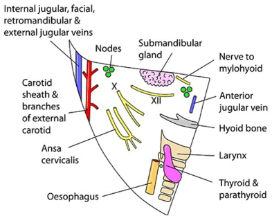 Contains Superficial veins (External Jugular and anterior jugular vein)