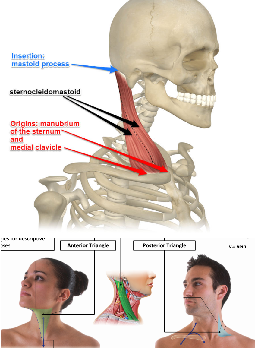 The sternocleidomastoid muscle divides each side of the neck