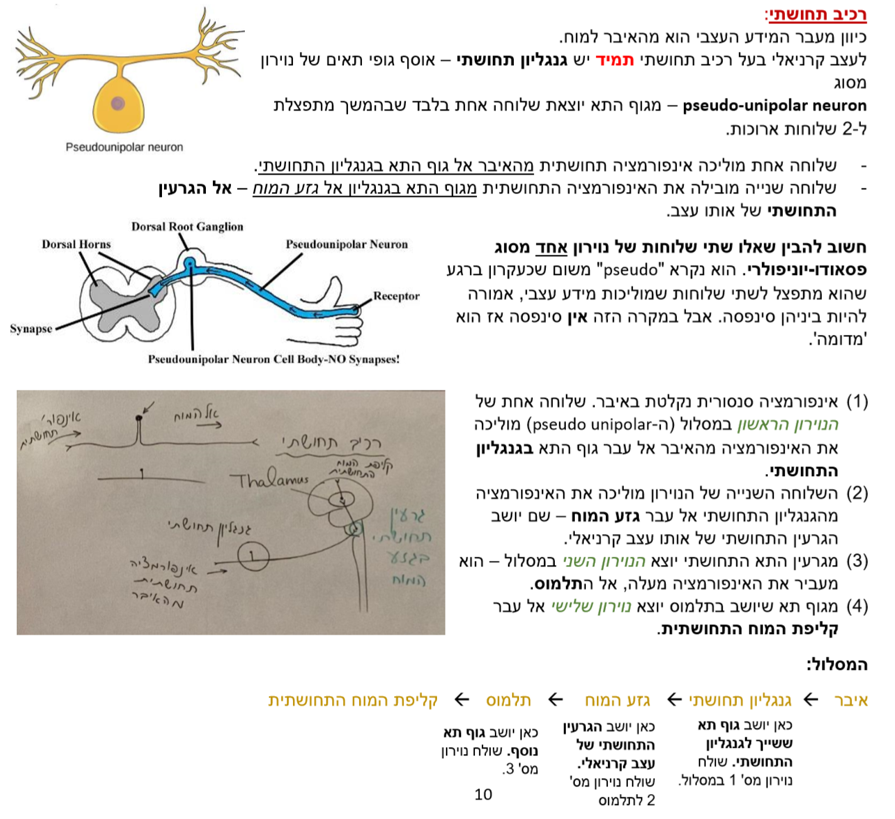איך עובד רכיב תחושתי של עצב? כיצד מתקשר הגנגליון התחושתי? מאיזה סוג נוירונים הוא מורכב? מהו המסלול החל מהאיבר? כמה נוירונים משתתפים בהעברת המידע?