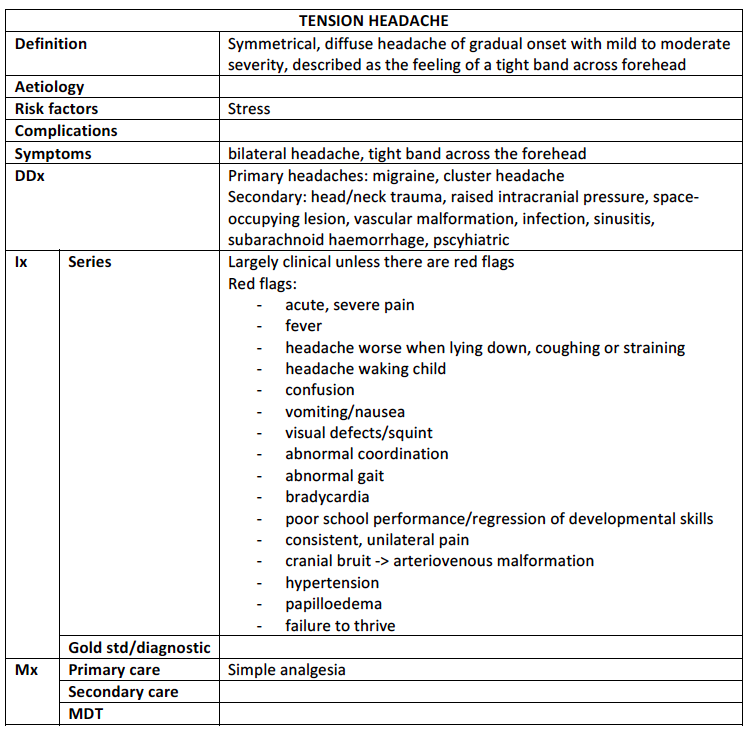 Outline the symptoms, aetiology, investigations and management of Tension Headache