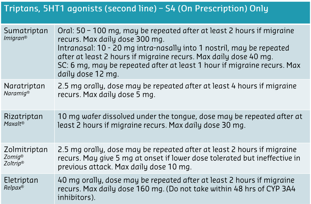 MOA: constrict cranial vessels by acting selectively at 5HT1B/1D receptors. Also thought to inhibit the abnormal activation of trigeminal nociceptors