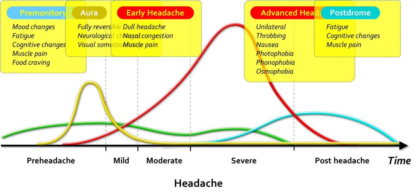 Starts as a premonitory phase then into an aura phase which only 1/3 of people experience then there is an early and advanced headache phase in which treatment should be done in the early headache phase then finally there is a postdrome phase