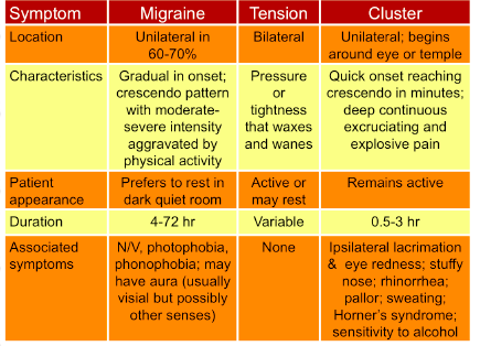 they are unilateral for the most part and described as having a gradual onset with a cesendo pattern of severity with aggrevation with physical activity. Commonly associated with N/V, photophobia, and aura