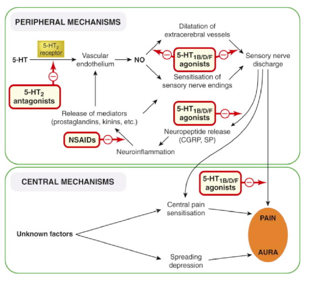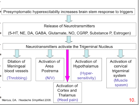 A number of triggers can lead to release of serotonin, nor, dopamine, GABA, glutamate, nitric oxide, CGRP, substance P, and estrogen and these NTMs produce a localized sterile inflammatory response leading to dilation of meningfeal blood vessels and activation of the trigeminal nucleus which collectively produce symptoms
