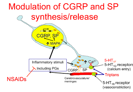through their effects on PGs, they reduce the production of inflammatory signals that would trigger MAPK upregulation and the increased neuronal production of CGRP and substance P for release from nerve endings