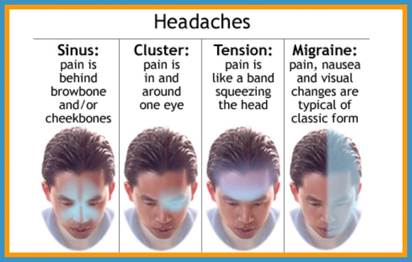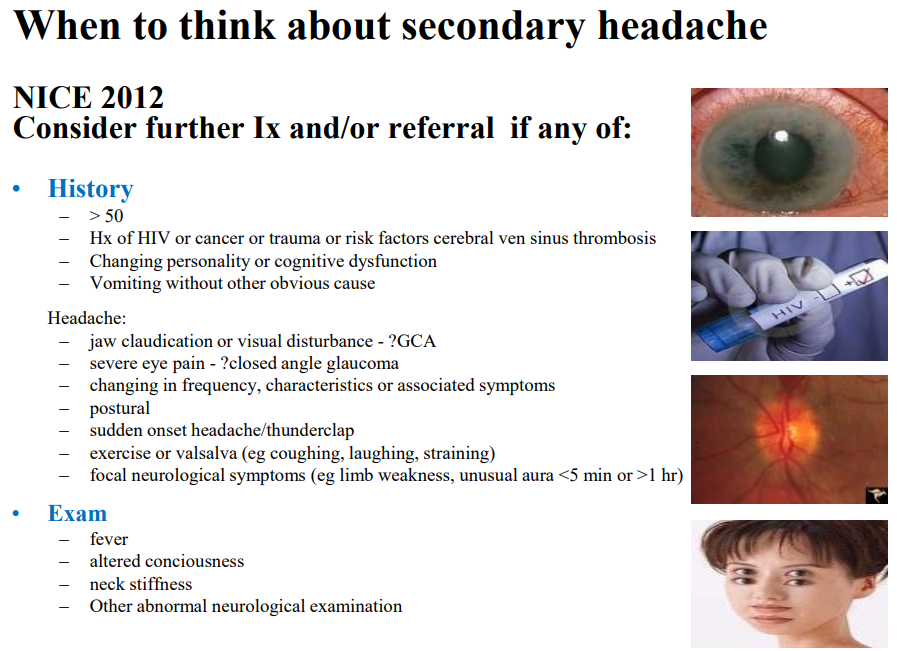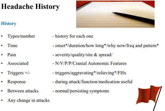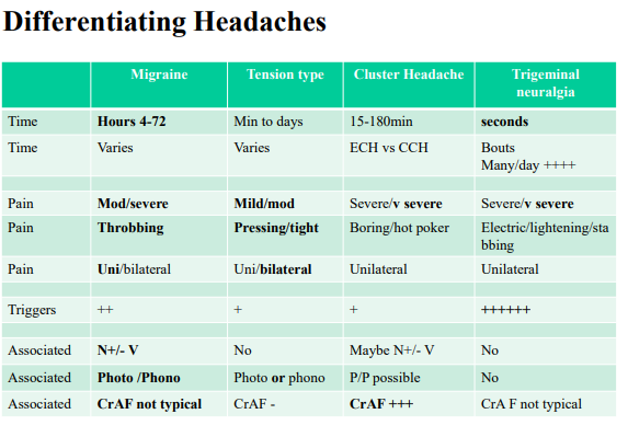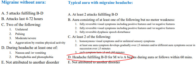 Aura (mins before) - visual disturqance - zigzag lines, dots, or somatosensory disturbance - parathesia