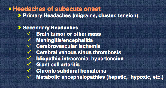 This slide presents a PARTIAL LIST of headaches that typically have a subacute onset. Note that the more common Primary Headaches fall into this category.