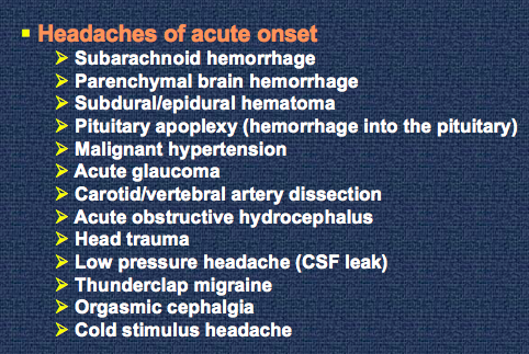This slide presents a PARTIAL LIST of headaches that typically have an acute onset