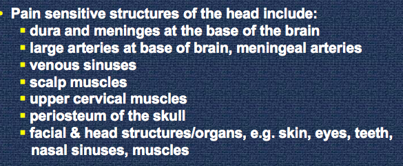 Many extracranial structures including the skin, nasal sinuses, teeth, eyes, cranial and cervical muscles all contain pain receptors.
