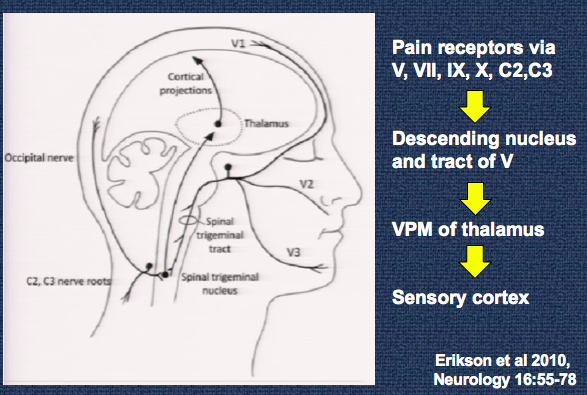 The trigeminal nucleus caudalis can be considered THE structure for anatomic and physiologic convergence of pain sensations. Hence pain from the face may be referred to the neck and vice versa, especially when the ophthalmic branch of CN V or V1 is involved.