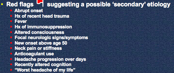 This slide lists some of the more prominent RED FLAGS that may signal an underlying secondary etiology for the headache.