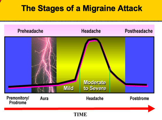 pre-headache, that is prodrome and aura, headache, and post-headache.