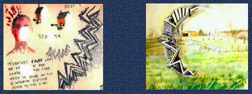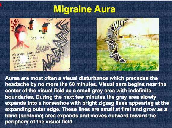 “fortification spectra” named after medieval forts that had zigzagging walls around them. The figures below presents artistic renditions of visual auras. Note the small round white spots (scotomas) in the left hand figure.