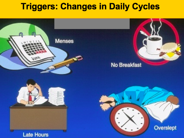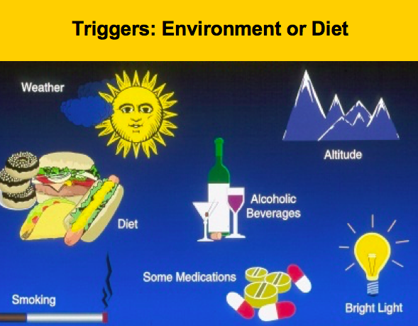 Many migraineurs recognize specific circumstances such as missing a meal, inadequate or too much sleep, red wines, certain nuts, chocolates, other foods, and smells, and so on, that can ‘trigger’ a migraine attack. This and the next two slides present some of these triggers in a graphic manner.