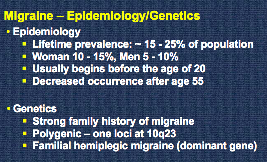 Migraine affects a huge proportion of the population with women being affected 2-3 times more frequently than men. Migraine carries a strong family history and its inheritance is thought to be polygenic. One rare form of migraine, Familial Hemiplegic Migraine, is caused by dominantly inherited genetic abnormalities at several different loci.