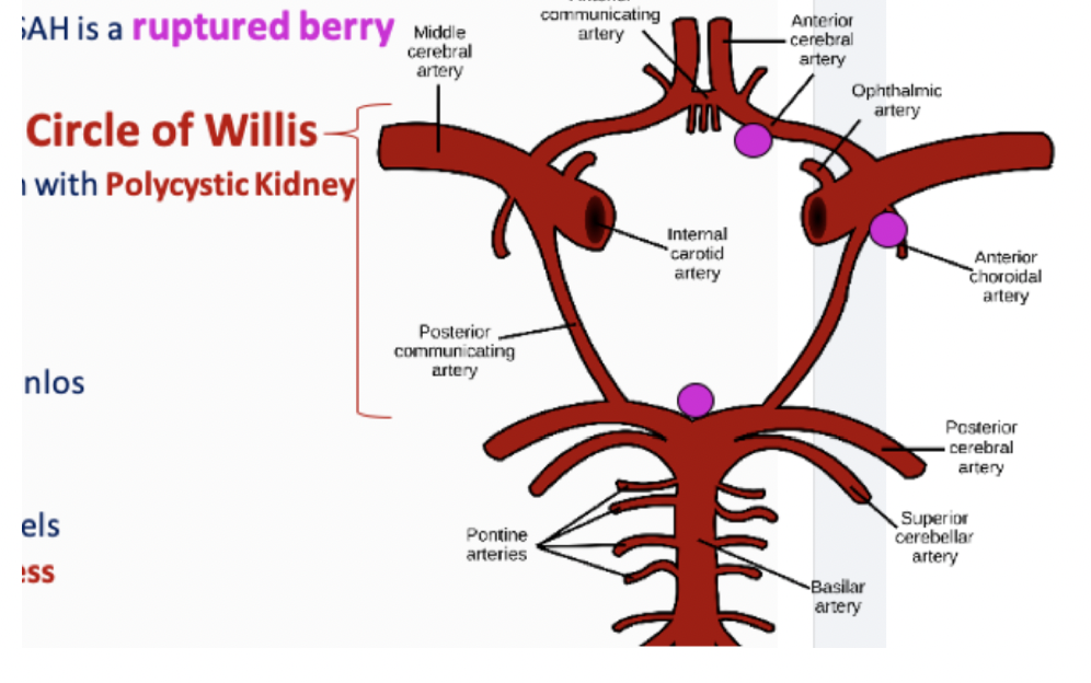 commest cause of non-trauamric SAH- rupture berry aneurysm (tends to grwon in circle or willis (associated with polycystic kidney disease)