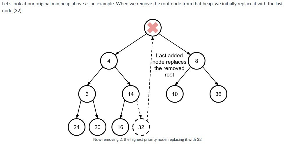 Whats the n-step process for removing the root node from a heap?
