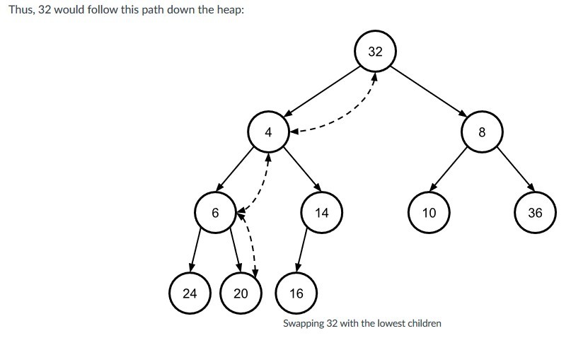 while priority > smallest child priority: swap with smallest child where priority is the new root node, and smallest child priority is the smallest child of that node