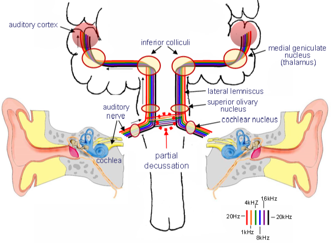 describe the auditory pathway from the auditory nerve to the primary auditory cortex