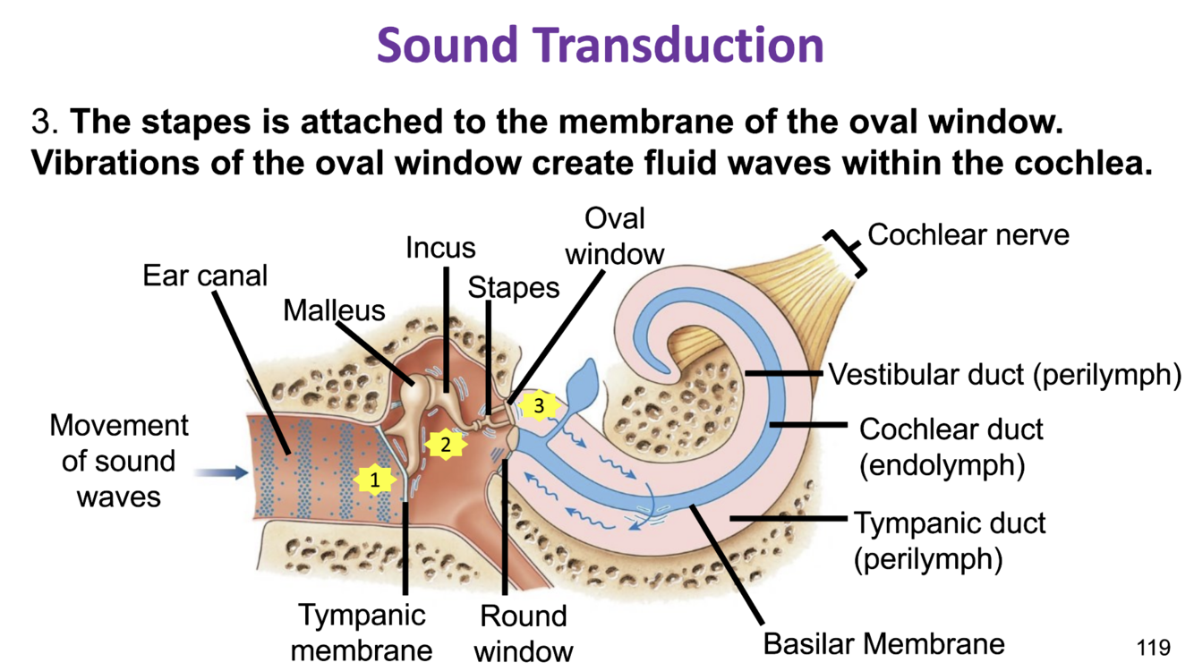 3) the stapes is attatched to the membrane of the oval window. vibrations of the oval window create fluid waves within the cochlea