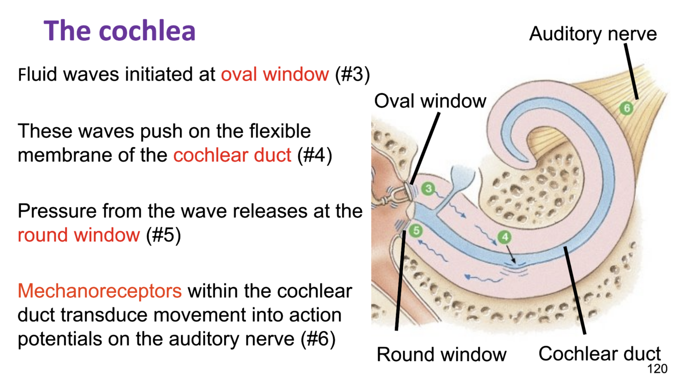 mechanoreceptors within the cochlear duct transduce movement into action potentials on the auditory nerve (#6)