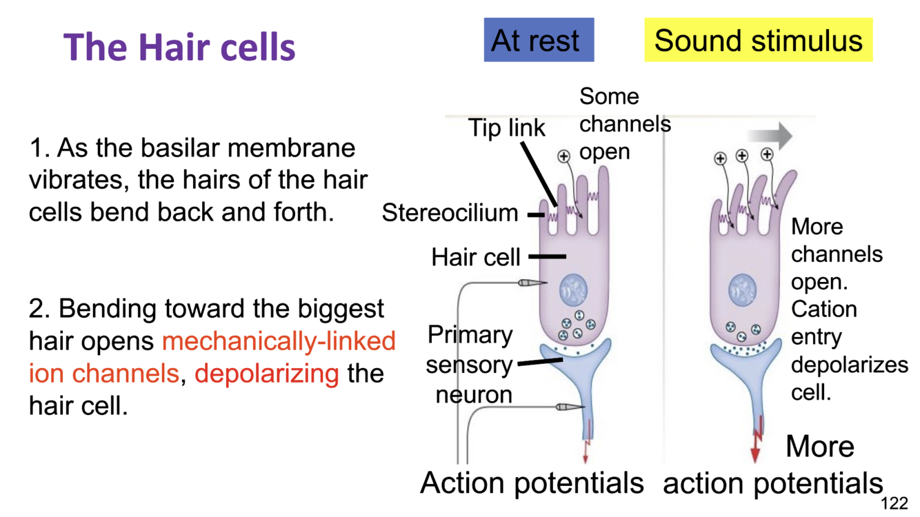 2) bending toward the biggest hair opens mechanically-linked ion channels, depolarizing the hair cell