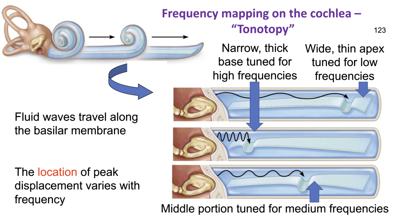 this occurs because of tonotopy (frequency mapping)