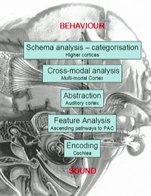 What are the levels of auditory processing from SOUND ⇒ BEHAVIOUR