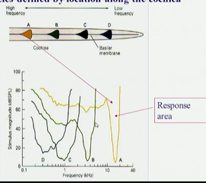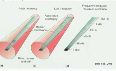 Cochlea is a filter and is tonotopically organised so frequency can be detected spatially from base to apex → detection in a discrete place in the cortex.