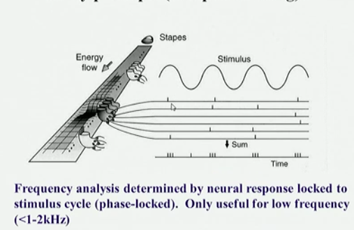 Low frequencies are temporal firing of nerve fibres in time to the frequency of the stimulus.