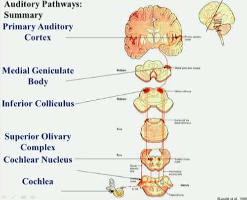 Do a step-by-step summary of the auditory pathways.